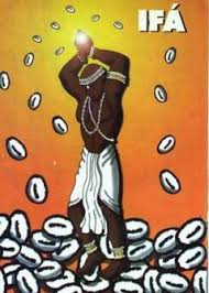 "Ifá era muito pobre e vivia da pesca. Então fez um trato com Legbá - o mensageiro celeste. Ele pediu que Exú lhe arranjasse riqueza e em troca ele seria à Exú como escravo por 16 anos. Exú, muito ladino, conhecedor das artes advinhatórias, ficou feliz em ter a companhia de Ifá. E aos poucos foi ensinando-lhe os segredos do futuro. Usava para ensinar a Ifá uns coquinhos de dendê. Mas, Ifá aprendeu tanto, que já não tinha vontade, nem tempo para limpar a casa de Exú. Um dia apareceu uma bela mulher na casa de Exú. Era Apetebi, e pediu para ajudar a arrumar a casa do Compadre. E aos poucos foi aprendendo a arte da adivinhação. Apetebi só se vestia de dourado e quando passava deixava um rastro de perfume. Ela não era outra se não Oxum. Oxum foi ensinada por lfá através do jogo com 16 coquinhos de dendê. E tanto aprendeu que Exú passou a responder a todas as perguntas da Yabá Menina".